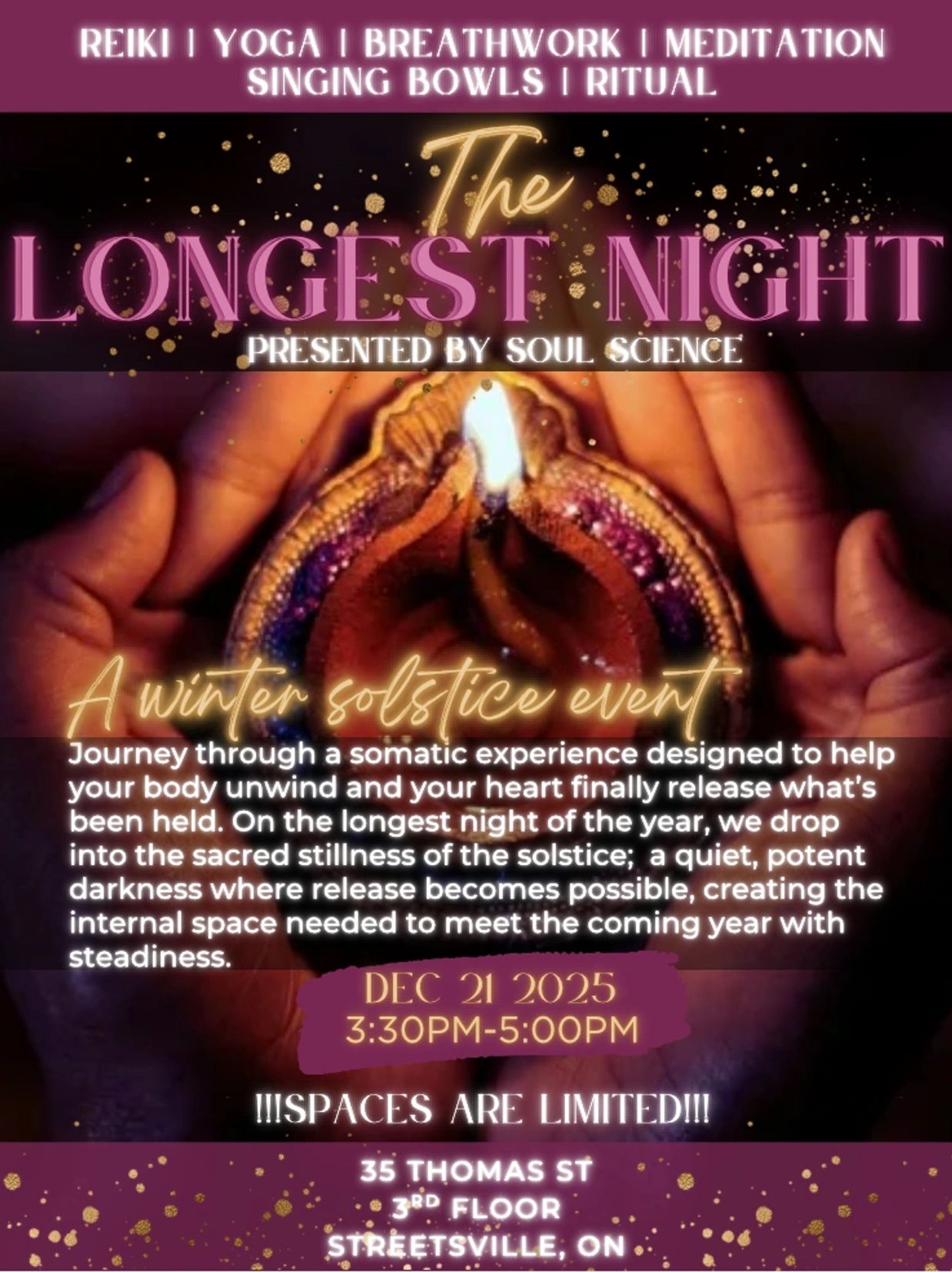 This December, step into the stillness of the Winter Solstice and give your body the ritual it’s been quietly asking for. “The Longest Night” is a deeply somatic Soul Science experience designed to help your system unwind, your heart soften, and the emotional weight of the past year finally loosen its hold.
